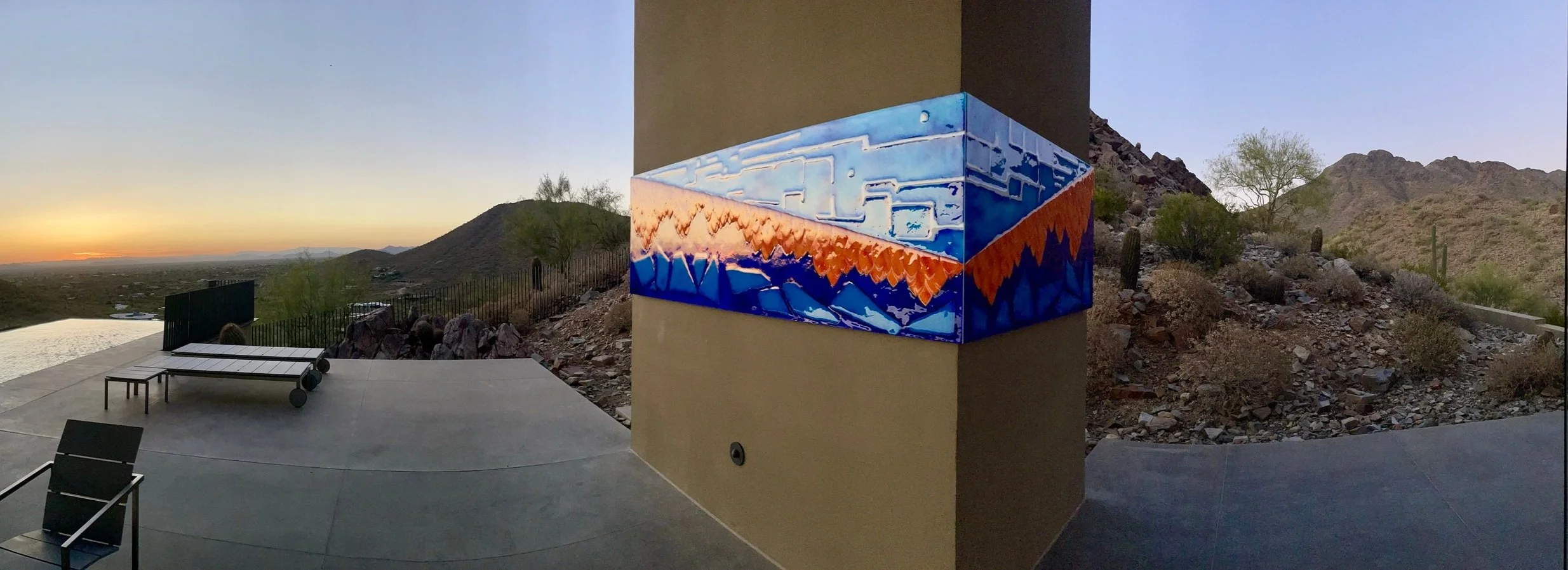The color palette is an interpretation of the desert sky, the surrounding mountains, a chilling ice shelf and the monarchs themselves. The composition of the Monarchs is a nod to Le Corbusier and the contribution of the butterfly roof to architecture.